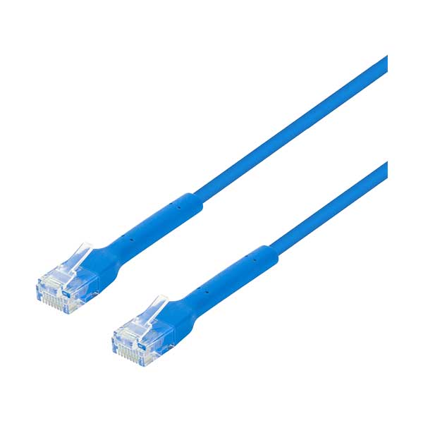 The Intellinet Cat6 U/UTP FlexiBoot Slim Network Patch Cable, available in a 10-pack of 5ft blue cables (745253), offers 10G / 1G speeds and a 250 MHz frequency in accordance with ISO/IEC 11801 and EN 50288 standards. It features pure bare copper wire for optimal conductivity and gold-plated contacts for corrosion-free connections. The ultra-thin format allows for enhanced flexibility and simplified cable management in dense installations, while the flexible connector covers protect RJ45 plugs and enable the cable to be bent to the desired angle. This cable is ideal for HDBaseT and PoE applications up to IEEE802.3bt / PoE++ / 4PPoE / Ultra PoE and is designed with heavy-duty strain relief. It is color-coded with T568A and T568B and has a standard 8P8C design, making it compatible with all network RJ45 connections.