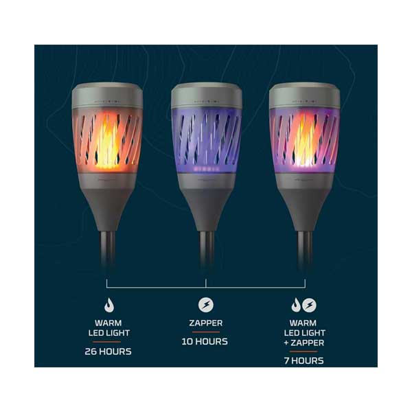 The NEBO Solar Torch Flying Insect Zapper (NEB-ZAP-0002) employs a strategic 360-degree design with dual-band UV attractant technology and 1300v electrical grid to efficiently eliminate mosquitos, flies, and gnats. This rechargeable device integrates warm glow LED illumination with specialized UV light, featuring whisper-quiet operation, automatic light sensors, and a removable base for maintenance. Engineered for both indoor and outdoor deployment, its impact-resistant construction ensures durability while operating smoke-free and odorless. Includes cleaning brush and 1-Year Warranty.