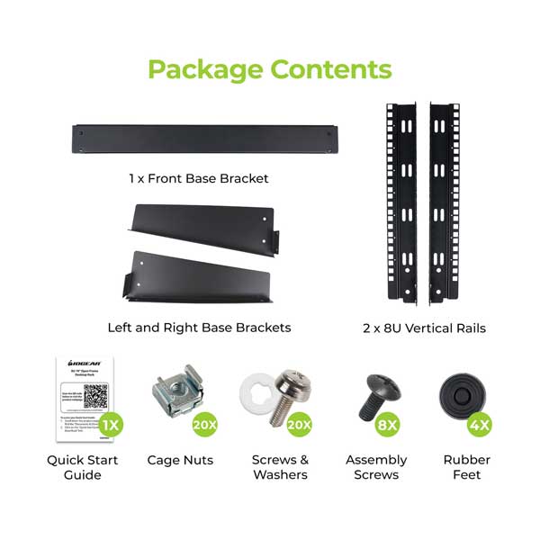 Included Hardware: 20x M5 Cage Nuts, 20x M5*16mm Rackmount Screws, 8x M5*12mm Assembly Screws, 4x Rubber Feet.