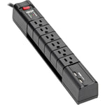 Model: TLP608RUSBB Product Type: Surge Protector Outlets: 6 NEMA 5-15R + 2 USB charging ports Surge Protection: 990 joules Cord Length: 8 ft. USB Ports: 2 USB charging ports (2.1A total) Features: EMI/RFI noise filtering, diagnostic LED, keyhole mounting slots Warranty: Lifetime limited warranty