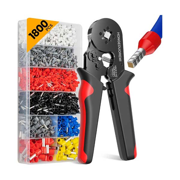The 1800-Piece 7~23AWG Wire Ferrule Self-Adjustable Crimping Tool Kit is tailored for wiring tasks involving wires, providing ample ferrule terminals for various projects. Made from premium copper and durable nylon, these ferrules ensure safe, long-lasting connections and resist overheating. The color-coded plastic collars and organized storage box enhance identification and work efficiency. Suitable for applications such as equipment switches, batteries, automotive, home electronics, and DIY wiring, this kit supports quick, secure connections, prevents wire damage, and improves cable management and insulation. Kit includes 1800 ferrule terminals, pliers, and a compact storage box.