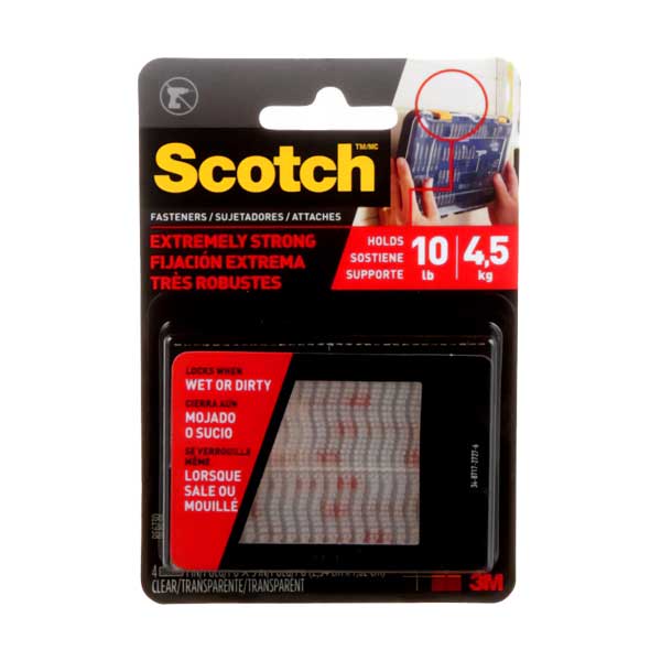 Scotch Extreme Fasteners deliver industrial-strength holding power without drilling, nailing, or fastening hardware. These transparent dual-lock strips feature a reusable design rated for up to 1,000 closures, making them an economical solution for temporary and permanent installations. The heavy-duty construction bonds reliably to metal, plastic, sealed wood, drywall, and glass surfaces, while UV and moisture resistance ensure performance in demanding indoor and outdoor environments. Each 1" x 3" strip holds up to 2 lbs, with a complete set supporting 10 lbs total. Ideal for securing tarps, mounting signage, organizing tools, and hanging décor without surface damage. The clear design maintains aesthetic appeal on transparent or finished surfaces.