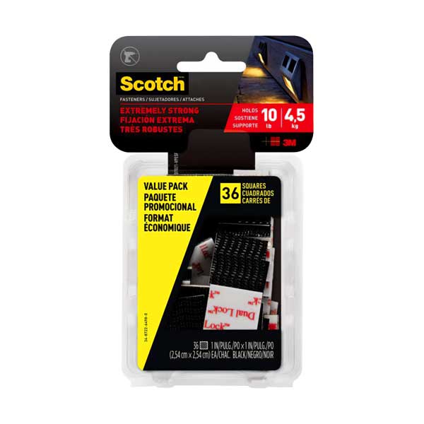 Secure demanding mounting tasks with the 3M Scotch Extreme Mounting Squares Heavy-Duty Value Pack. This 36-count collection of 1-inch black fasteners utilizes advanced reclosable dual-lock technology to deliver immediate, permanent adhesion without tools or fasteners. Each set supports up to 2 lbs, with individual squares rated for substantial loads. Built for durability, these squares resist weather, UV exposure, and dirt while maintaining reliable performance on varnished wood, bare metal, drywall, plastic, and sealed concrete. The pressure-sensitive acrylic adhesive enables effortless application indoors and outdoors, making them ideal for mounting signage, organizational systems, and decorative elements. With up to 1,000 reclosable cycles per square, this value pack delivers dependable, long-term holding power for both residential and commercial applications.