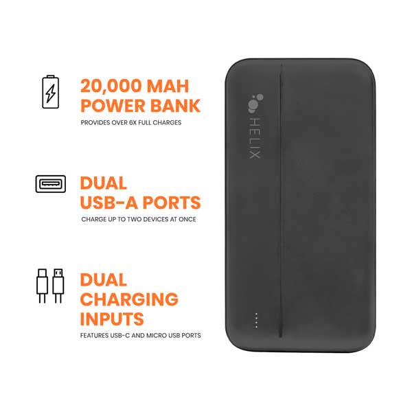 Introducing the Helix ETHPB20N, a 20,000 mAh power bank featuring dual USB-A and a single USB-C port for efficient charging. Enjoy the convenience of slim portability as you charge up to three devices simultaneously. With its dimensions measuring 5.71 inches in height, 2.56 inches in width, and 0.98 inches in depth, this power bank is perfect for travel. Plus, with the included USB-C cable, you can easily charge your phones, tablets, iPads, earbuds, and other USB powered devices. Trust in this power bank's impressive capacity to provide up to 6x full charges.
