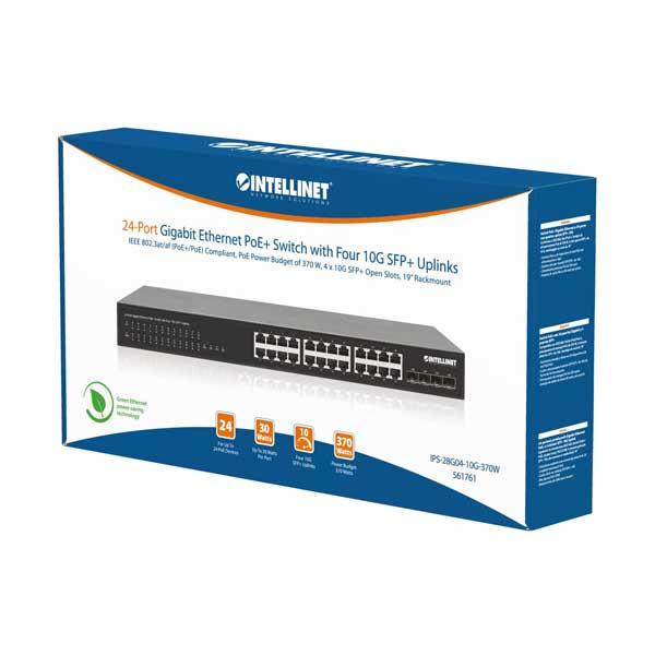 The Intellinet 24-Port Gigabit PoE+ Switch delivers enterprise-grade connectivity with 24 PoE+ ports capable of supplying up to 30W per device from a substantial 370W power budget. Four 10G SFP+ uplink ports provide high-speed fiber connectivity, while the 128 Gbps switching fabric ensures wire-speed performance across all ports. Engineered for demanding applications including IP surveillance, VoIP systems, and wireless infrastructure, this switch combines IEEE 802.3at/af compliance with comprehensive protection circuitry. The compact 1U rackmount design accommodates 16,000 MAC addresses and supports jumbo frames up to 12KB, making it an ideal backbone solution for scalable network deployments. NDAA compliant.