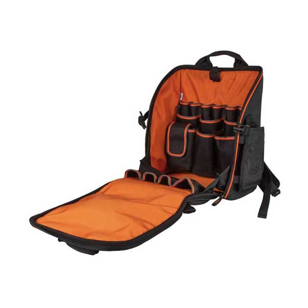 The Klein Tools Tradesman Pro Tool Station Backpack is a high-quality backpack specifically designed for tradespeople to conveniently carry and store their tools. With 21 pockets and a spacious interior, it offers maximum tool storage. The front flap can be unzipped halfway for quick access to tools or fully opened for easy access to a convenient workstation. Made from 1680d ballistic weave material, the backpack is water-resistant and durable. It also includes an elastic loop for holding a removable hands-free worklight (sold separately).