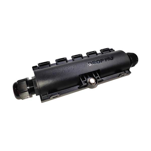 The LYNN HyperDrop PAS Mini IP68-rated splicing and patch enclosure is designed for installation in outdoor environments and is ideal for connecting fiber, twisted pair, and other low-voltage cables. Its water-tight latching mechanism makes it easy to open, and the included grommets can accommodate a range of cable sizes and constructions. The enclosure also features an easily visible fiber splicing tray and is compatible with various couplers and splice connections. Made from a durable ABS and poly-carbonate blend with UV inhibitors, it is suitable for use in underground, pole-mounted, wall-mounted, or wire suspended installations.
