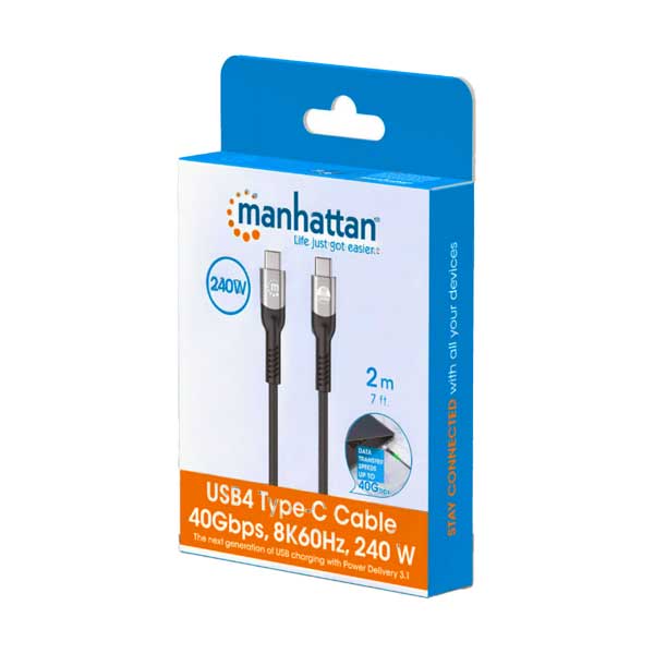 This Manhattan USB4 Type-C cable delivers next-generation connectivity with 240W Extended Power Range charging via USB Power Delivery 3.1, making it ideal for demanding devices like high-performance laptops and MacBook Pro models. The cable achieves 40Gbps data transfer speeds and supports 8K@60Hz single-display or 4K@60Hz dual-display video output, while maintaining full backward compatibility with earlier USB Power Delivery standards. Built with reinforced braided shielding and strain relief, it works seamlessly with USB4, Thunderbolt 3, and Thunderbolt 4 interfaces. At 2 meters in length, this future-ready cable combines premium durability with professional-grade performance for power users and content creators.