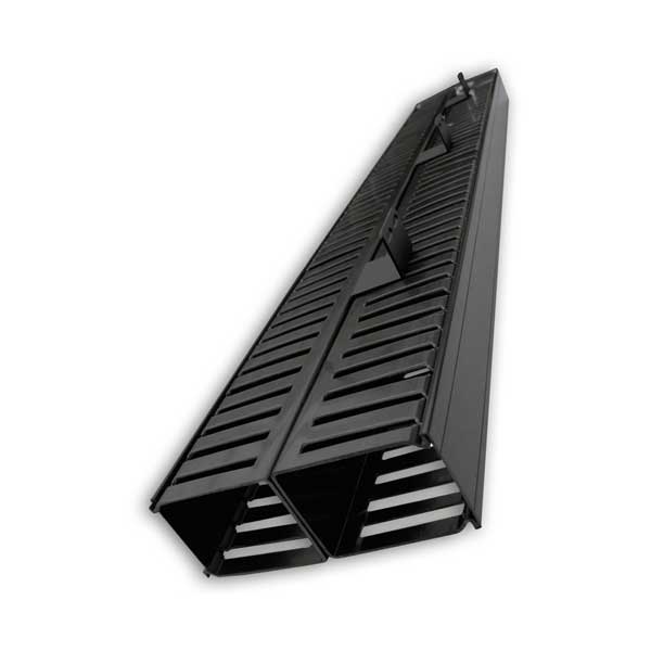 The Quest VR-07-140 delivers professional cable organization for 2-post open frame racks and floor enclosures with its innovative dual-sided design. Standing 6 feet tall, this vertical cable manager accommodates up to 140 cables (70 per side) through strategically positioned finger ducts that simplify routing and maintenance access. Built from robust 18 AWG cold-rolled steel with a refined black powdercoat microfinish, it combines durability with a polished appearance. The integrated PVC duct and cover system conceals wiring for a clean, professional look while protecting cables from damage. Complete with all mounting hardware, the VR-07-140 streamlines infrastructure management in demanding data center and server environments.